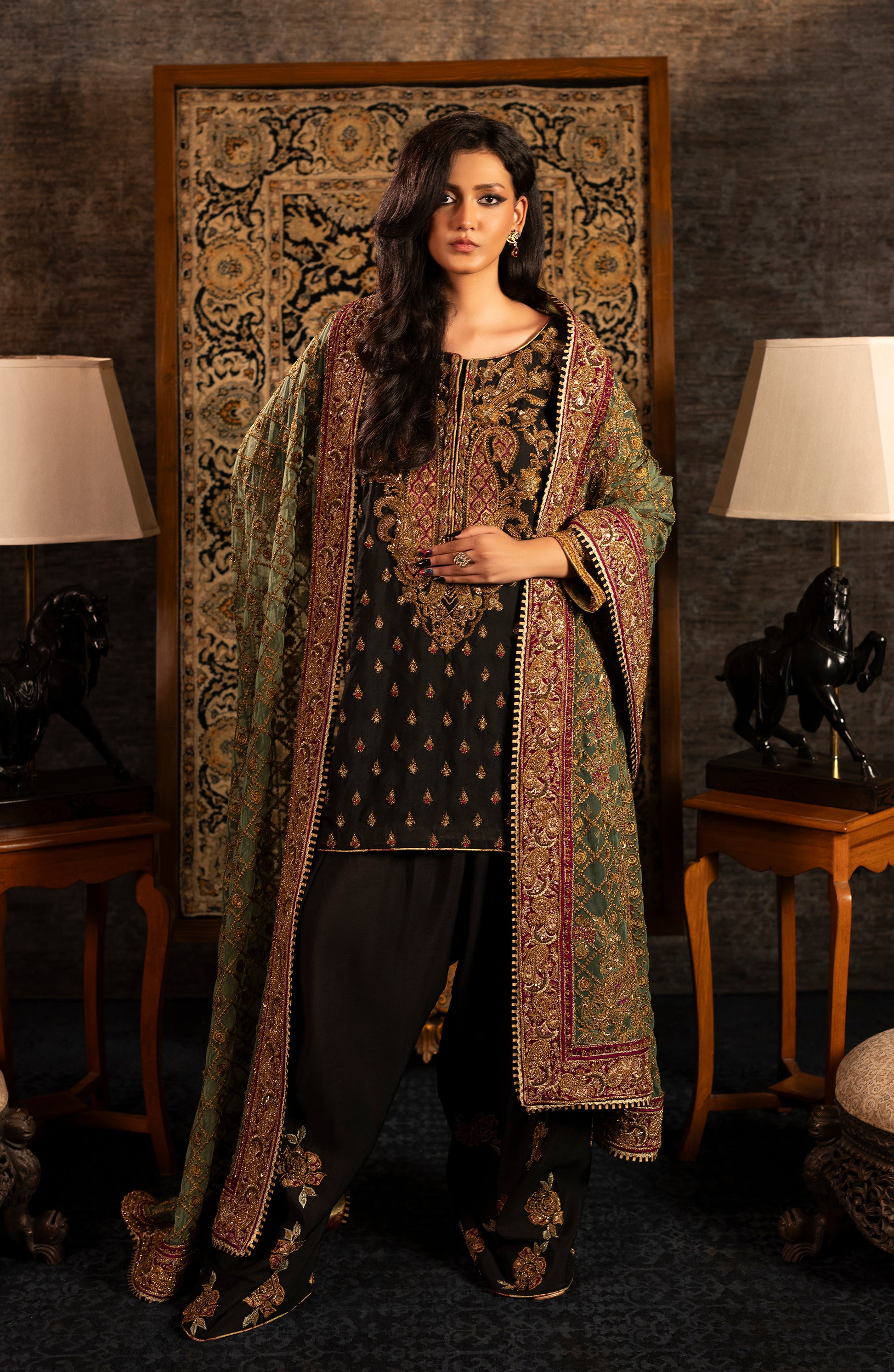 In commanding black, a short kameez with paisley appliqué and green-fuchsia accents paired with farshi shalwar and emerald dupatta. A tribute to regal heritage reimagined.
