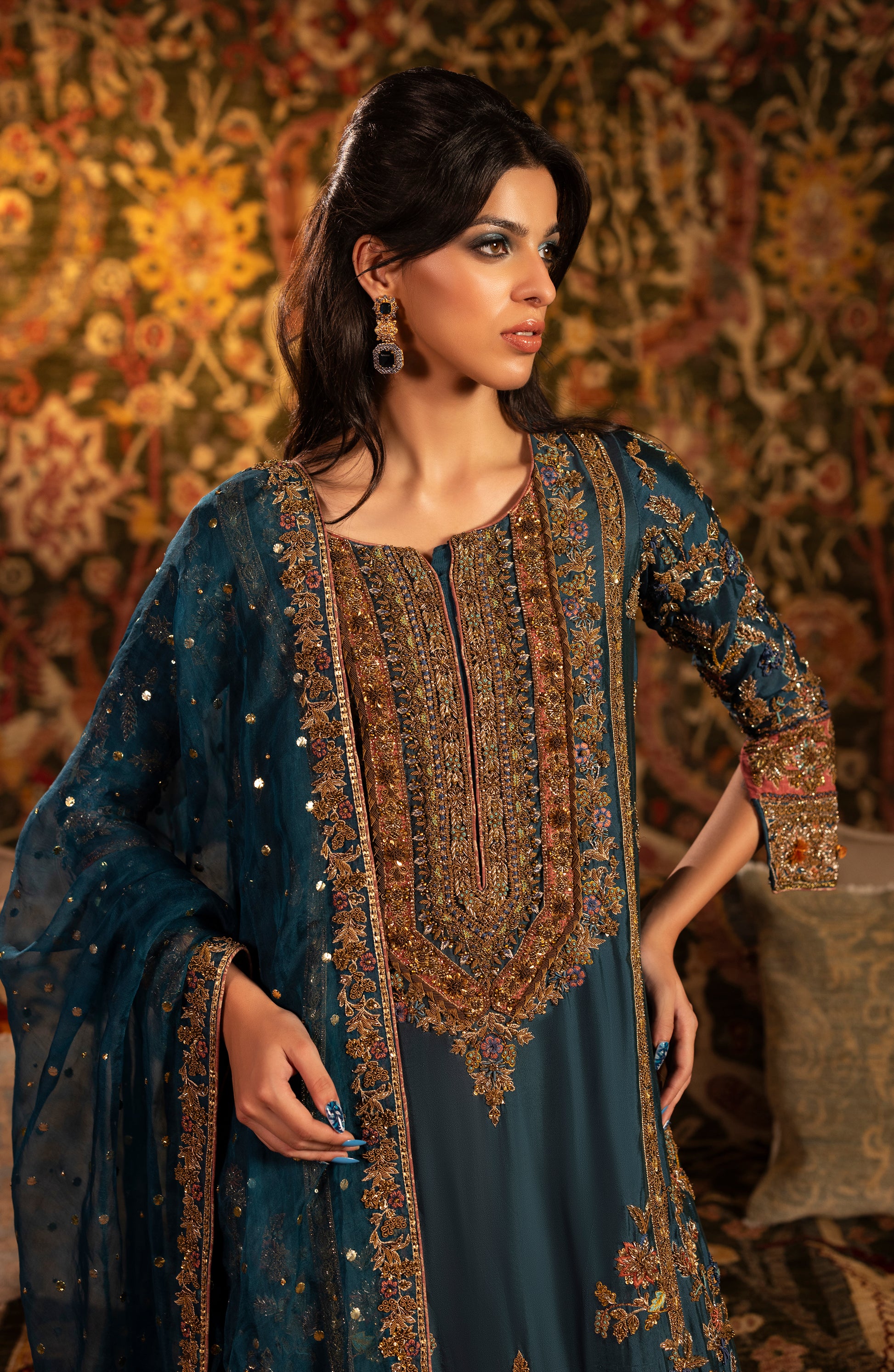 Opulent teal long kameez with floral embroidery and ornate borders paired with navy palazzos and organza dupatta. A masterpiece of balance and refinement.