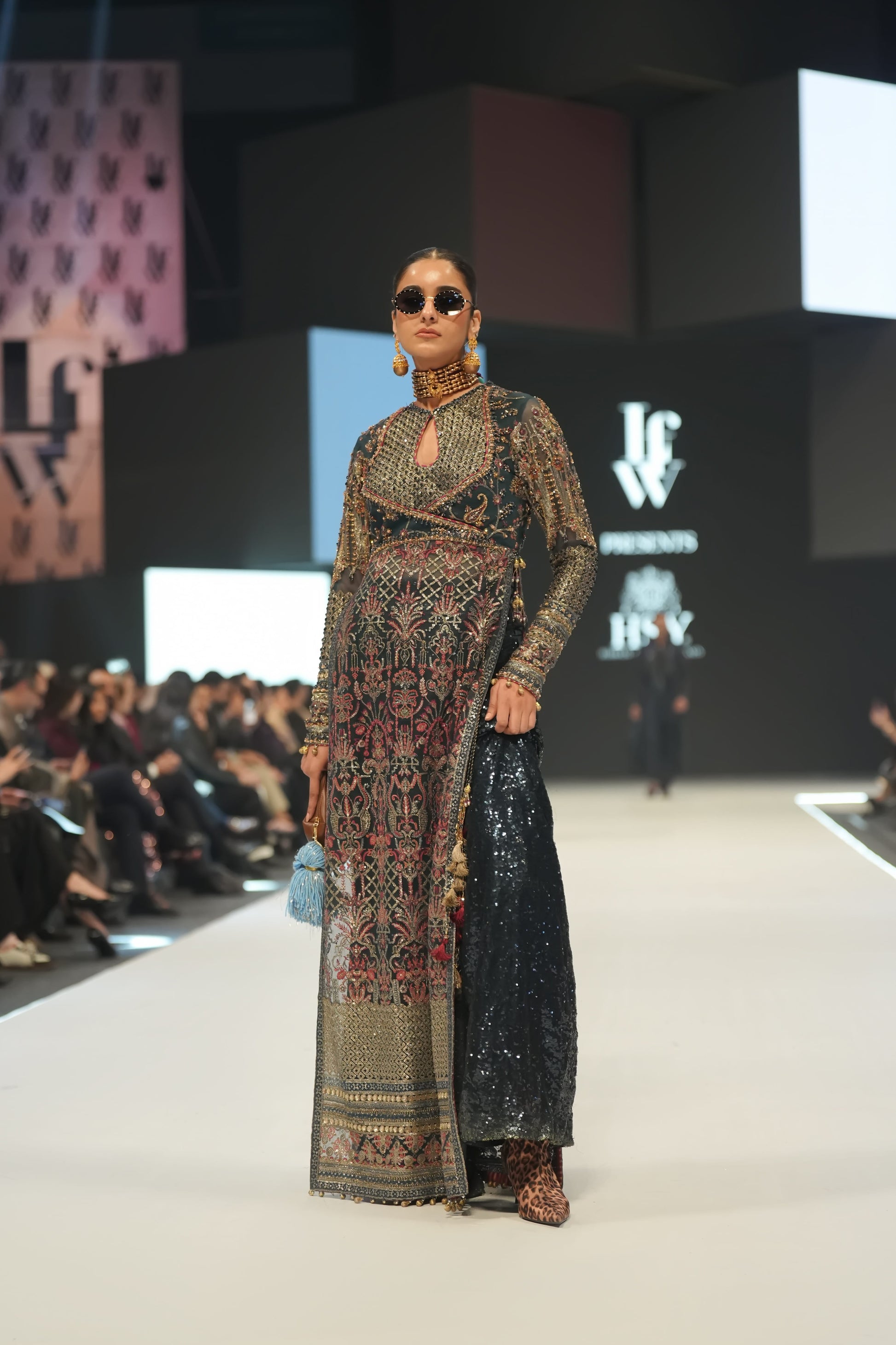 A striking floor-length shirt crafted in deep graphite-blue tones, featuring a richly hand-embellished long shirt adorned with intricate crystal-work, moti and sequin detailing. The silhouette is elevated with an angrakha detailing on the bodice with contrasting textures. The look is paired with a dramatic, sequin lower accentuated by subtle shimmer. Finished with artisanal tassel details, the look embodies bold elegance and HSY’s signature fusion of heritage craftsmanship with modern edge.