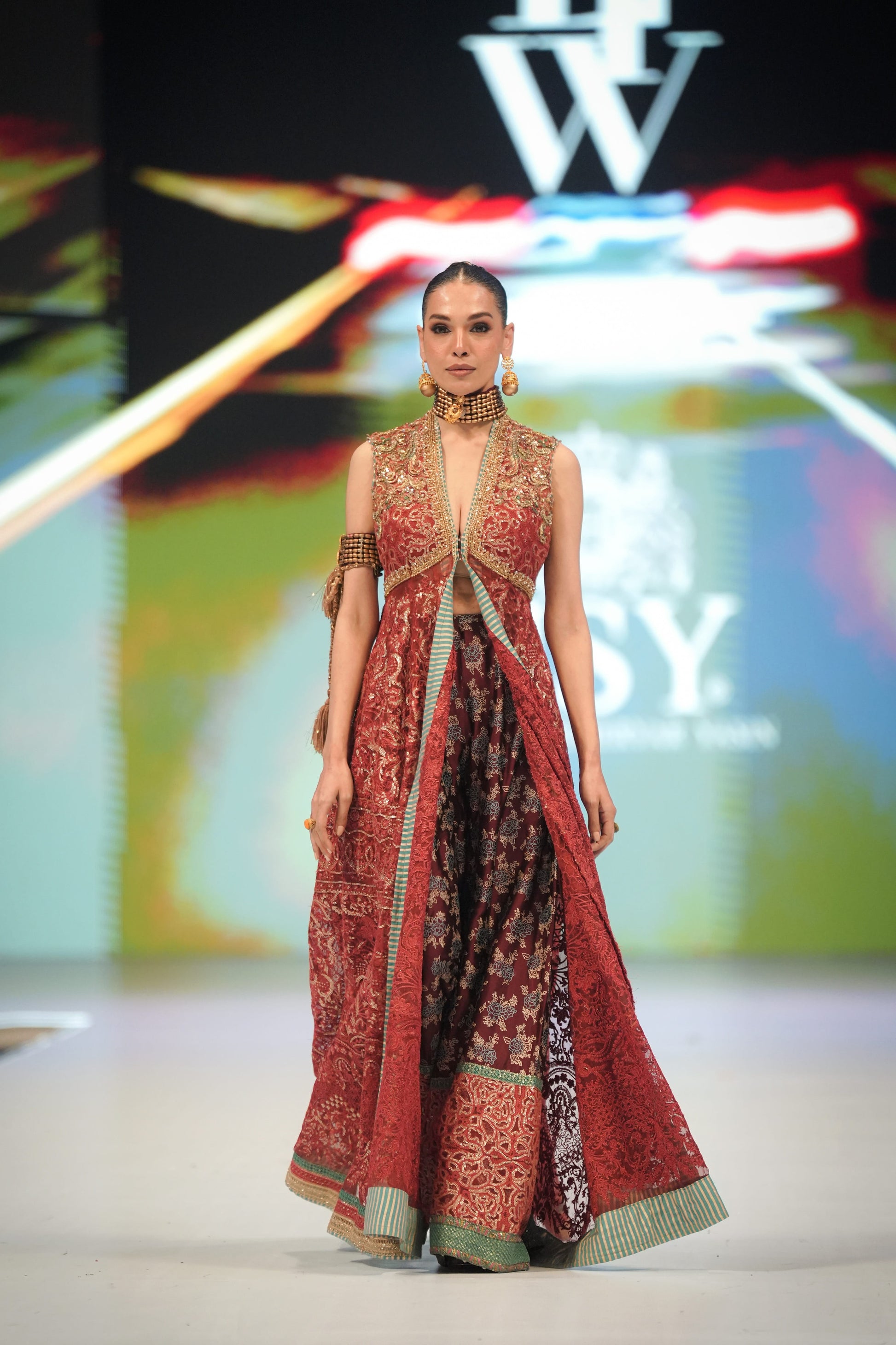 A front-open kalidaar overlay crafted with generous panels that create fluid movement and dramatic volume. The embroidered and sequin heavy base adds texture, while contrasting cutwork borders frame the silhouette with intricate detail. Paired with flared Izhar pants, in multi-colored printed roses - the look balances contrast, structure and ease, making it effortlessly statement-worthy.