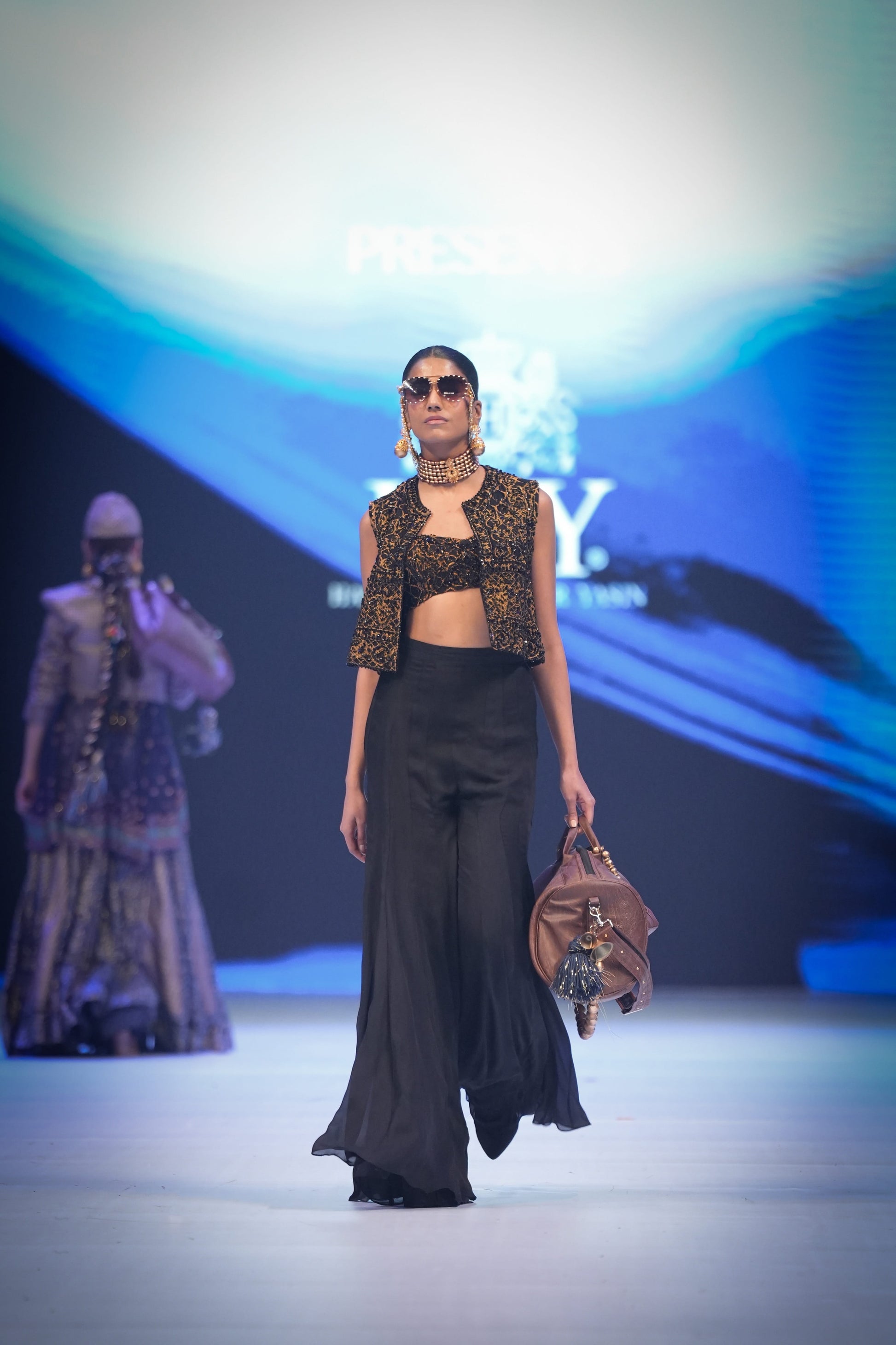 A striking black ensemble featuring a structured cropped jacket adorned with intricate gold embroidery and black crystal embellishments, layered over a matching bustier and flowy pants. The shimmering details on the jacket contrast beautifully against the deep black base, while the fluid pants add movement and elegance. This combination of sparkling accents, and flowing silhouettes creates a look that is both powerful and effortlessly glamorous.