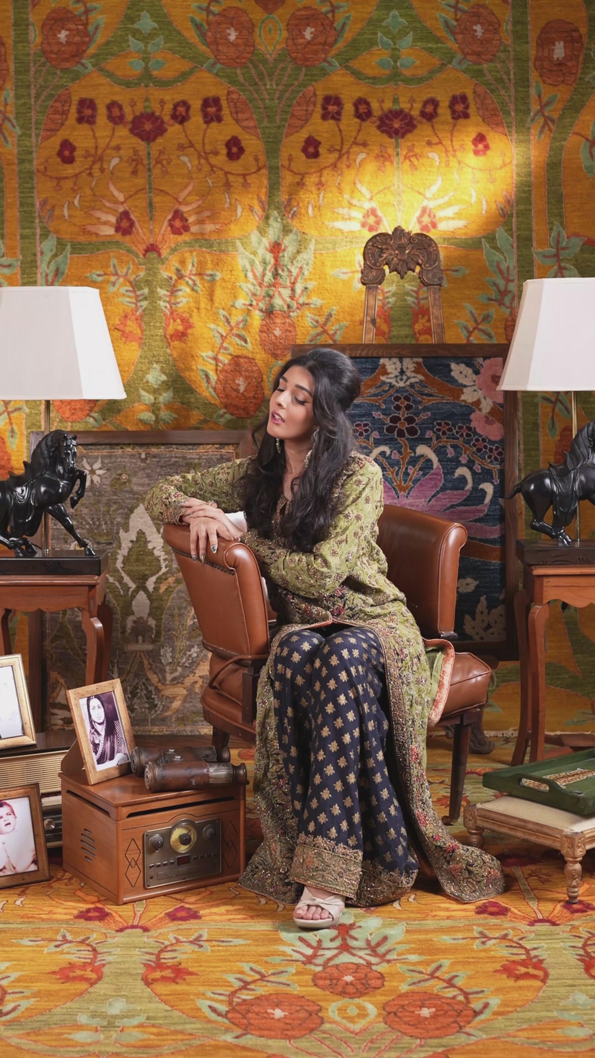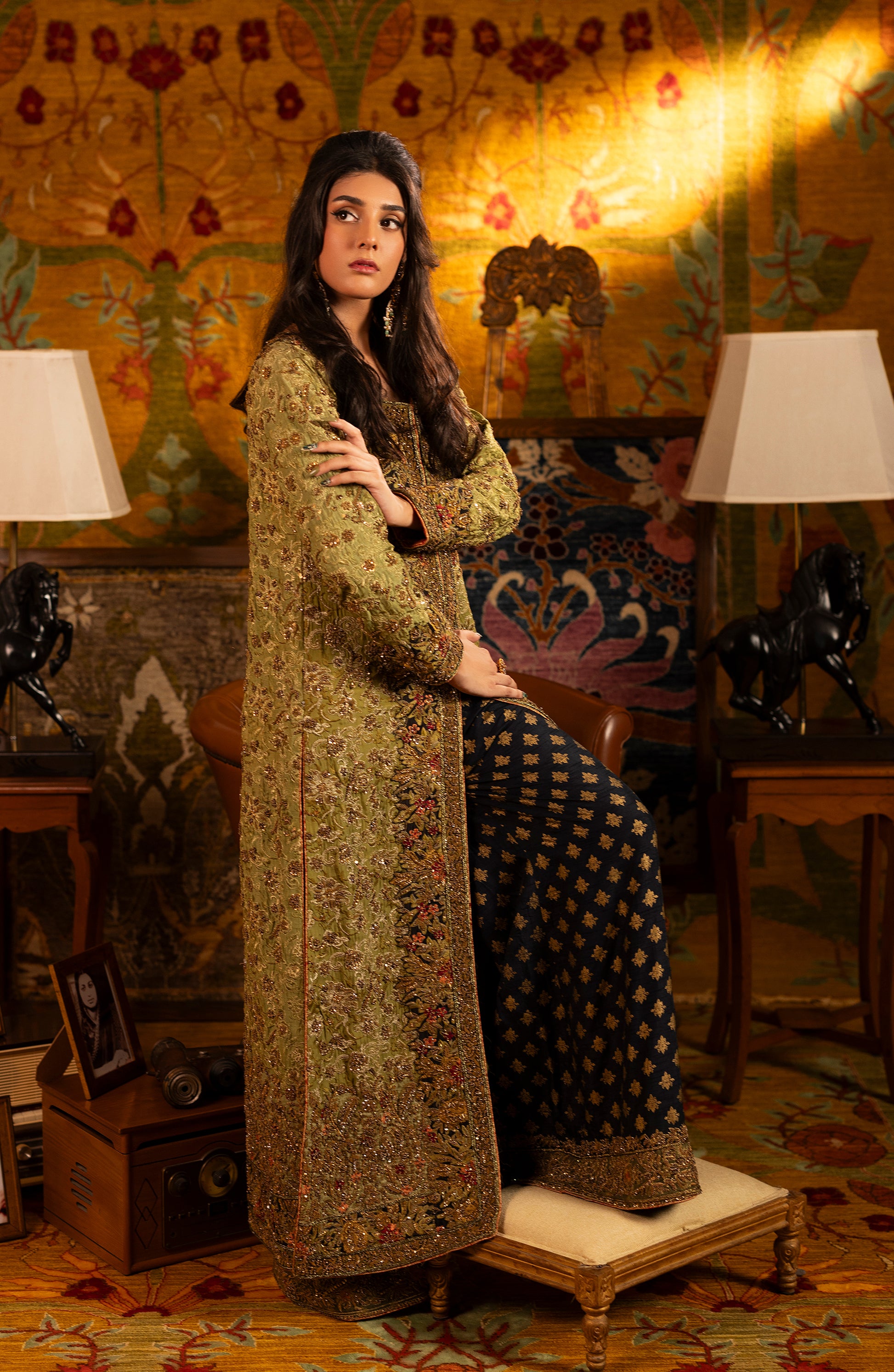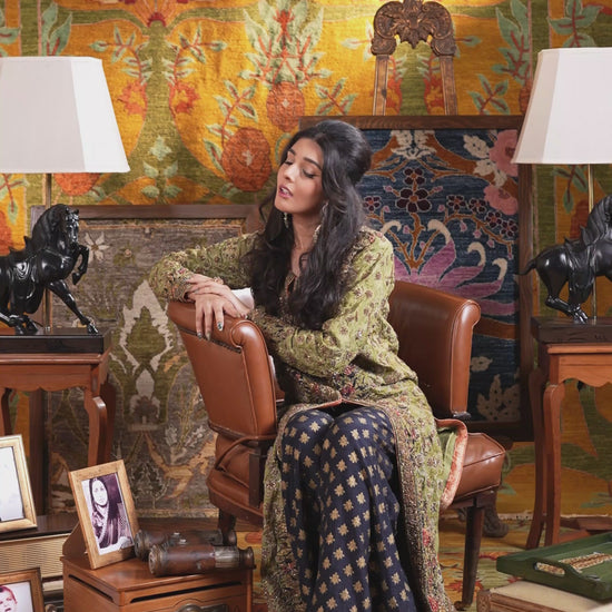 A vivid parrot green jacket with navy patch detailing and gold tilla work paired with navy palazzo trousers. Embellished in red and orange hues — bold, ornate, and festive.