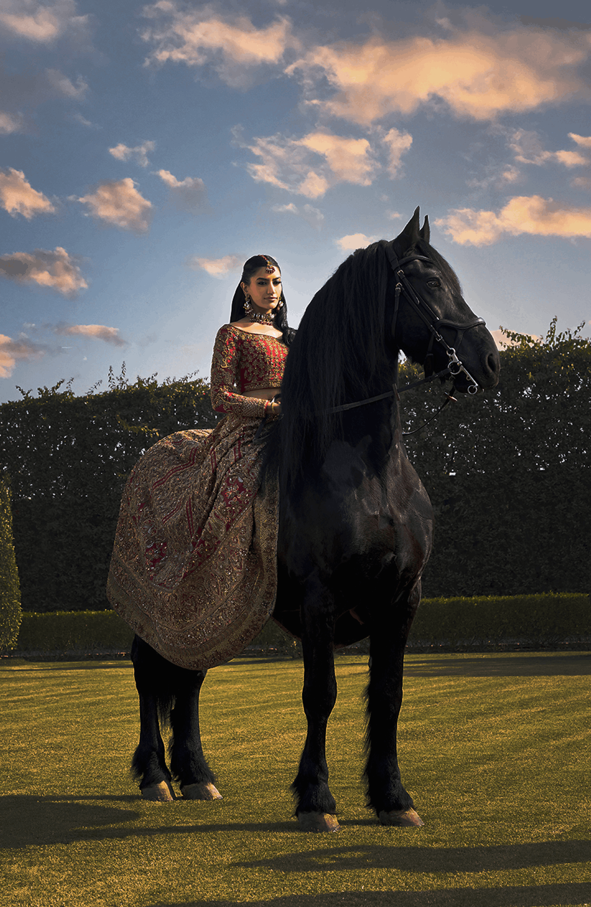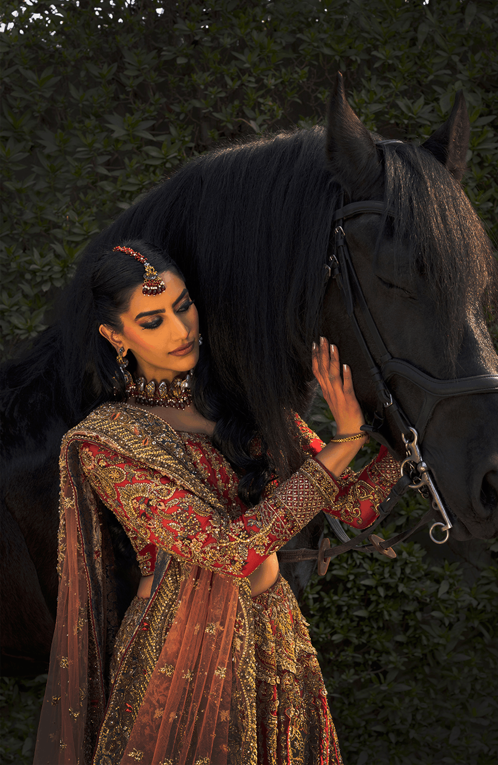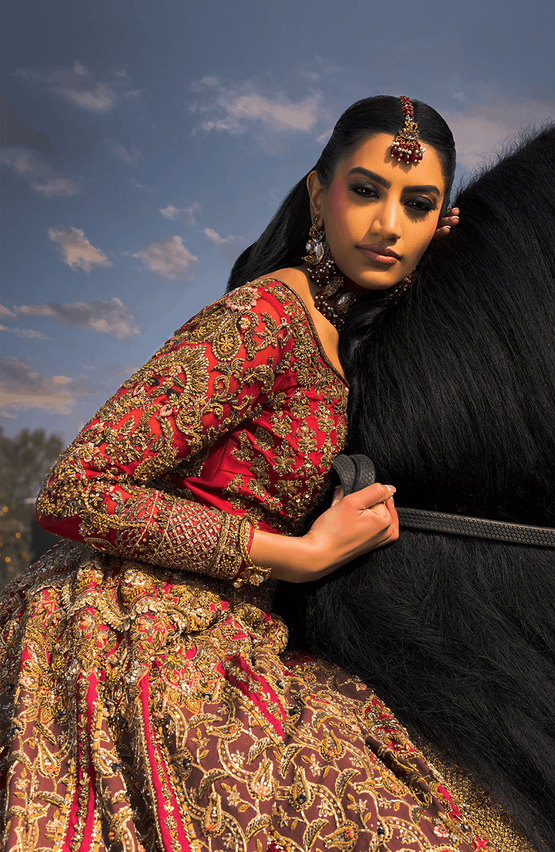 A striking HSY signature red serves as the canvas for this bridal masterpiece, adorned with antique-gold embroidery enriched with navy, peach, and saffron hues. The paneled lehenga features heavy borders, a screen-printed base, and hallmark HSY embellishments. A contrasting peach net dupatta with ornate borders and floral vines completes the look.