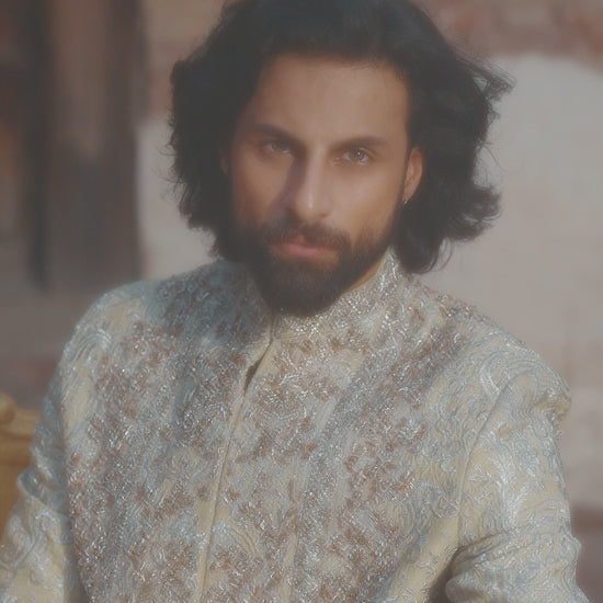 A regal sherwani in light beige tone, crafted from sumptuous silk. Adorned with intricate silver embroidery, the design is elevated by exquisite chandi tilla work and bronze accents, creating a masterpiece of opulence. Paired with a perfectly coordinated silk kurta and shalwar, this sherwani embodies timeless luxury and sophistication.