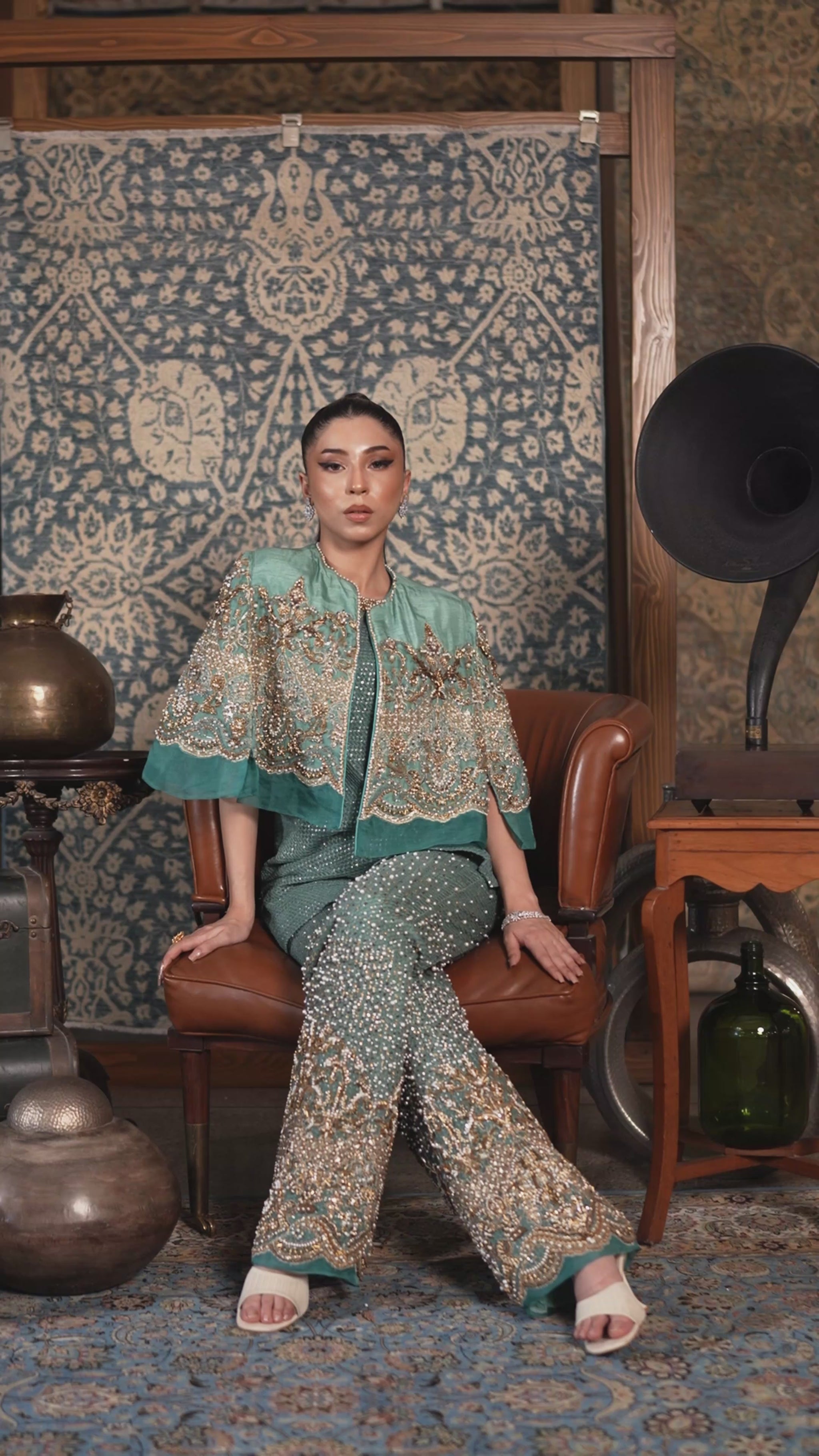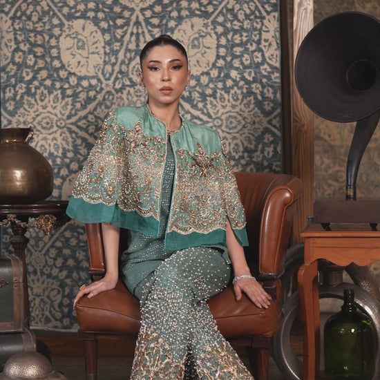 A serene Tiffany blue co-ord featuring a structured tunic, boot-cut pants, and a statement embellished cape with resham and sequins. Gold and champagne embroidery add opulent contrast, balancing sophistication and allure.