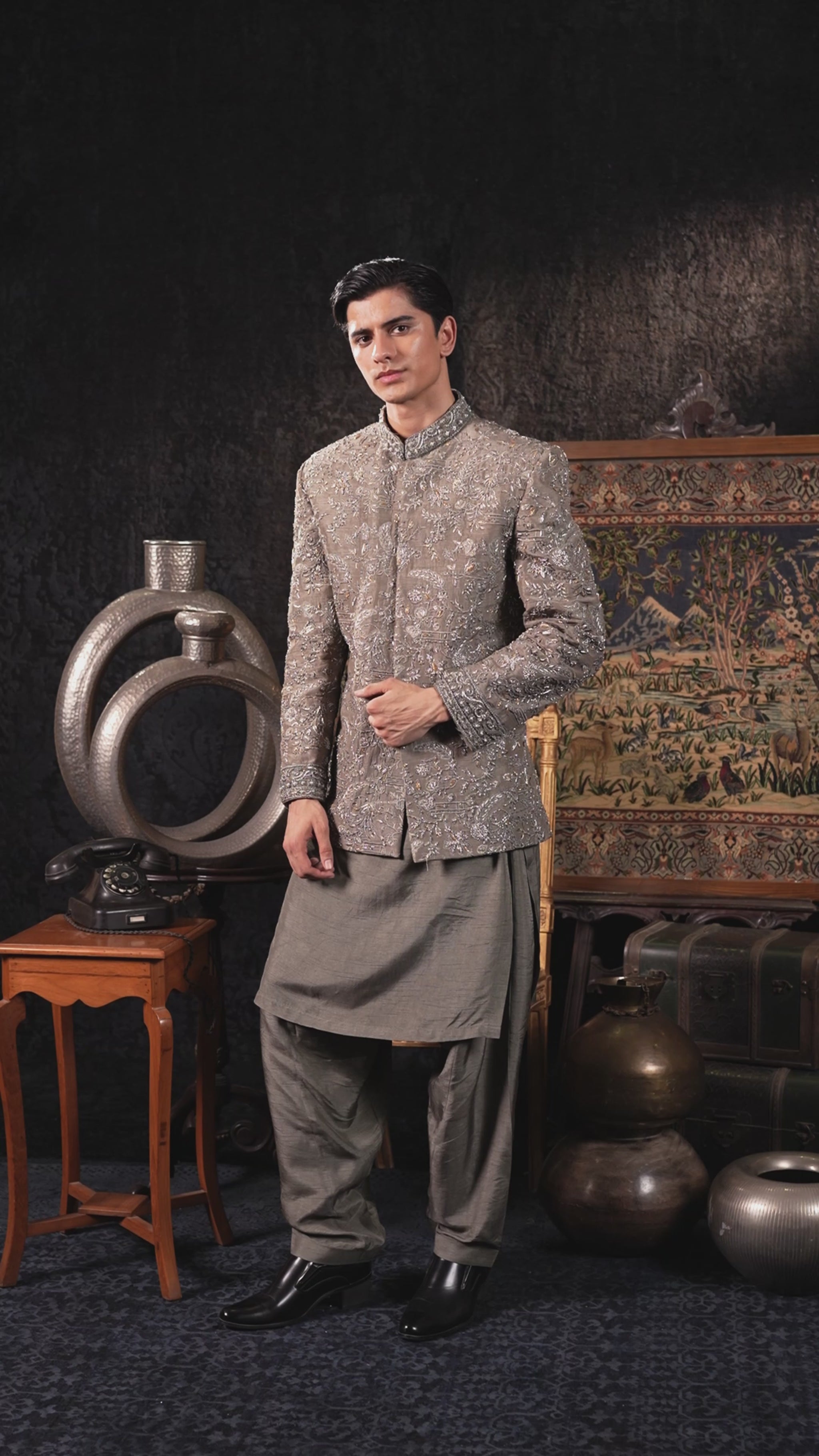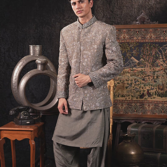 A refined warm grey sherwani, intricately detailed with silver-toned embroidery that enhances richness and texture. The subtle sheen highlights its regal fabric, while the structured cut brings timeless poise. Paired with a coordinating shalwar, this look captures a perfect balance of heritage and modern sophistication.